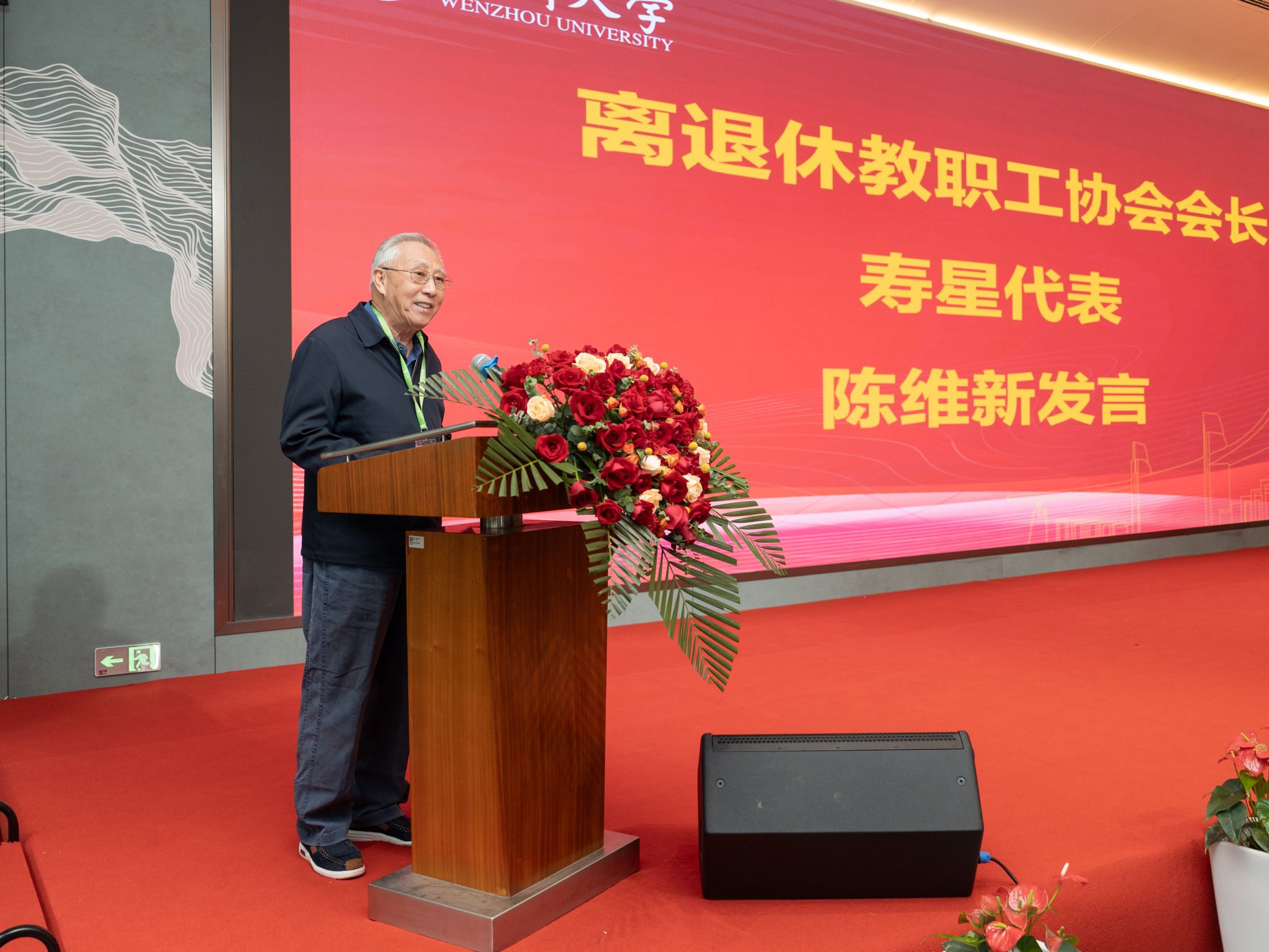 离退休教职工协会会长兼寿星代表陈维新老师发表了情真意切的感言。站在人生又一个新的整十节点上,作为“逢十寿星”代表,他深情回望了亲历学校从温师专到温师院、再到今日温州大学的发展历程,将其视为毕生最宝贵的财富。陈老师由衷感恩组织的培养、前辈的指引、同事的帮助和朋友的鼓励,表示虽青丝已成白发,但对在党的领导下拥有幸福安定的晚年生活深感庆幸。他盛赞学校取得的跨越式发展成就,并深情感谢学校党委、各部门以及离退休协会无私奉献的志愿者们对老同志工作的重视与倾情服务,并与老同志们相约十年后祝寿会上再共聚。