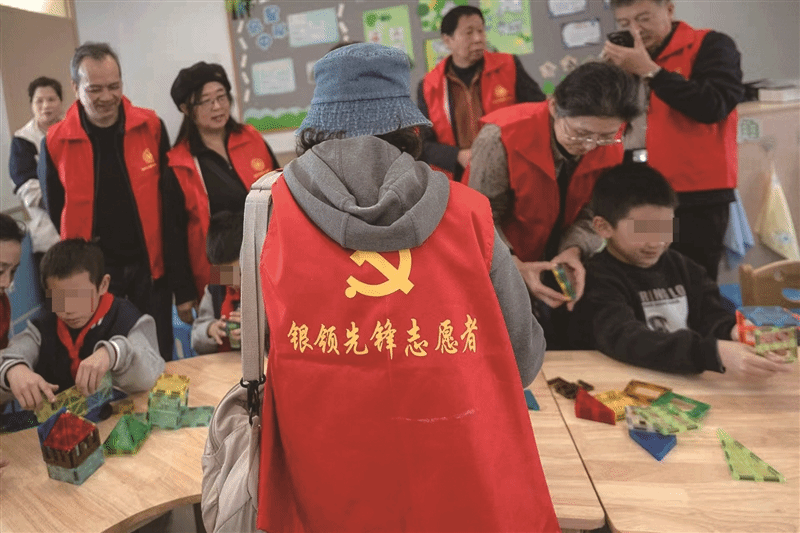 在互动活动中,教室讲台变成了一个充满温情的小舞台。一名学生用清亮的嗓音朗读课文,另一名学生表演儿歌演唱。最动人的画面出现在搭积木环节:志愿者们俯下身,与孩子们围坐在一起,一颗接一颗、一块接一块,共同搭建起五彩的造型。“起初他可能有些害怕,不敢伸手尝试,”一位银发志愿者分享道,“但在一次次示范和鼓励下,他终于试探着伸出手,我们一起完成了积木的搭建。”这位志愿者表示,面对这些特殊的孩子,需要保持充分的耐心,用真诚让他们感受到温暖,“他们的每一个小小举动,都是一次勇敢的对外沟通,我们要及时回应给予鼓励。”