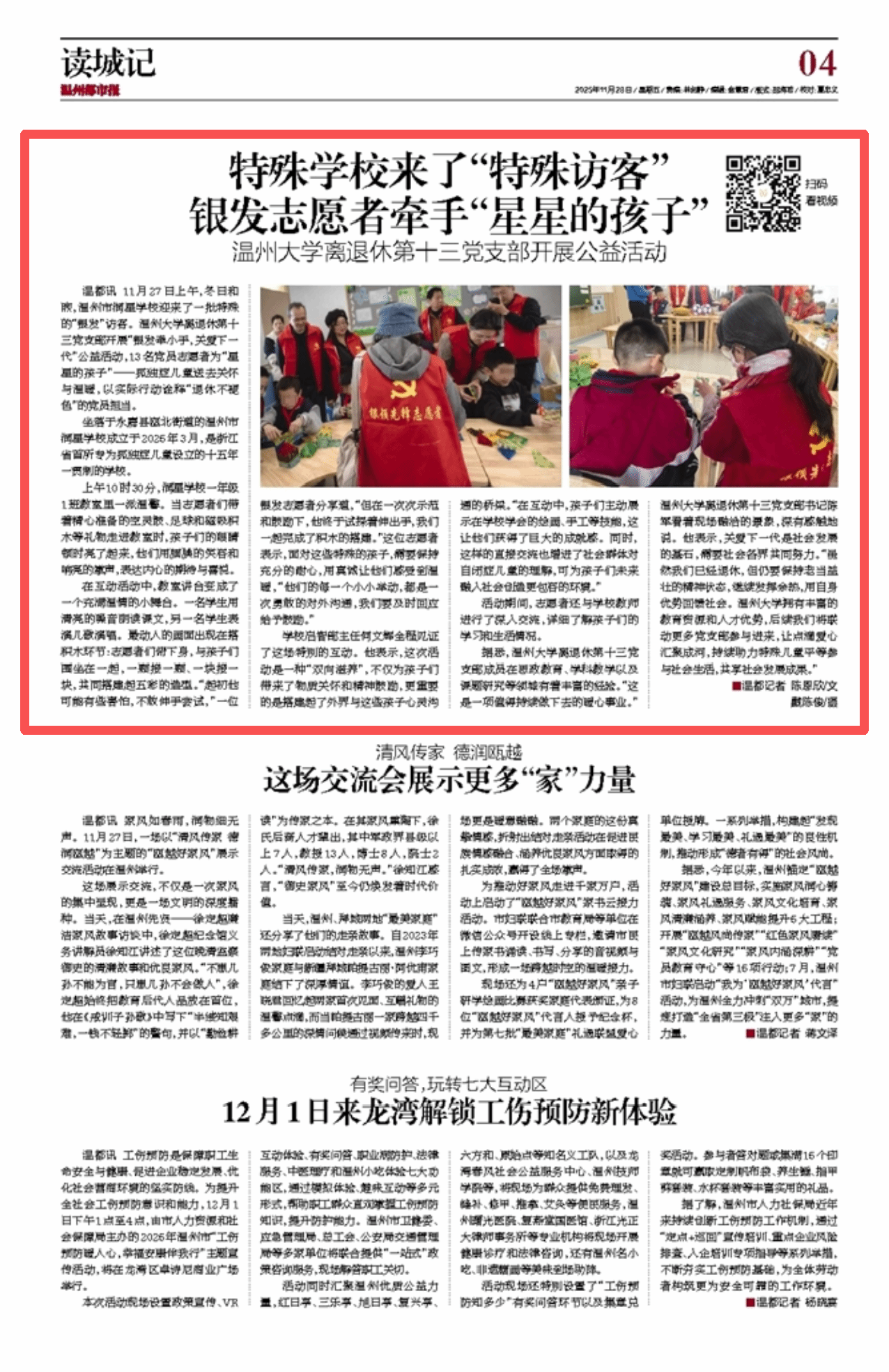 11月27日上午,冬日和煦,温州市润星学校迎来了一批特殊的“银发”访客。温州大学离退休第十三党支部开展“银发牵小手,关爱下一代”公益活动,13名党员志愿者为“星星的孩子”——孤独症儿童送去关怀与温暖,以实际行动诠释“退休不褪色”的党员担当。