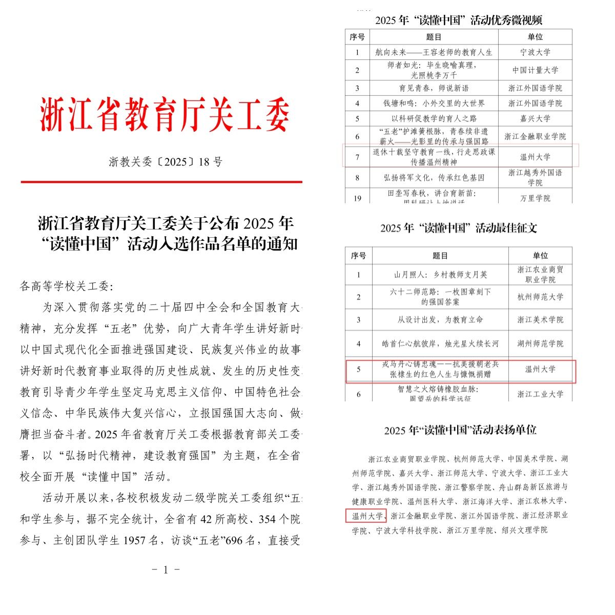 我校离退休处联合人文学院组建2支学生团队与2位“五老”同志结对访谈,在宣传部老师的指导下,推送的作品喜获佳绩:《戎马丹心铸忠魂——抗美援朝老兵张棣生的红色人生与慷慨捐赠》入选最佳征文名单,全省报送611篇,共11篇获“最佳征文”称号;《退休十载坚守教育一线,行走思政课传播温州精神》入选优秀微视频名单,全省报送微视频198个,有12部获“优秀微视频”;同时温州大学因组织工作得力、成绩突出,被列入“活动表扬单位”,这是我校关工委工作首次获省级专项表扬。