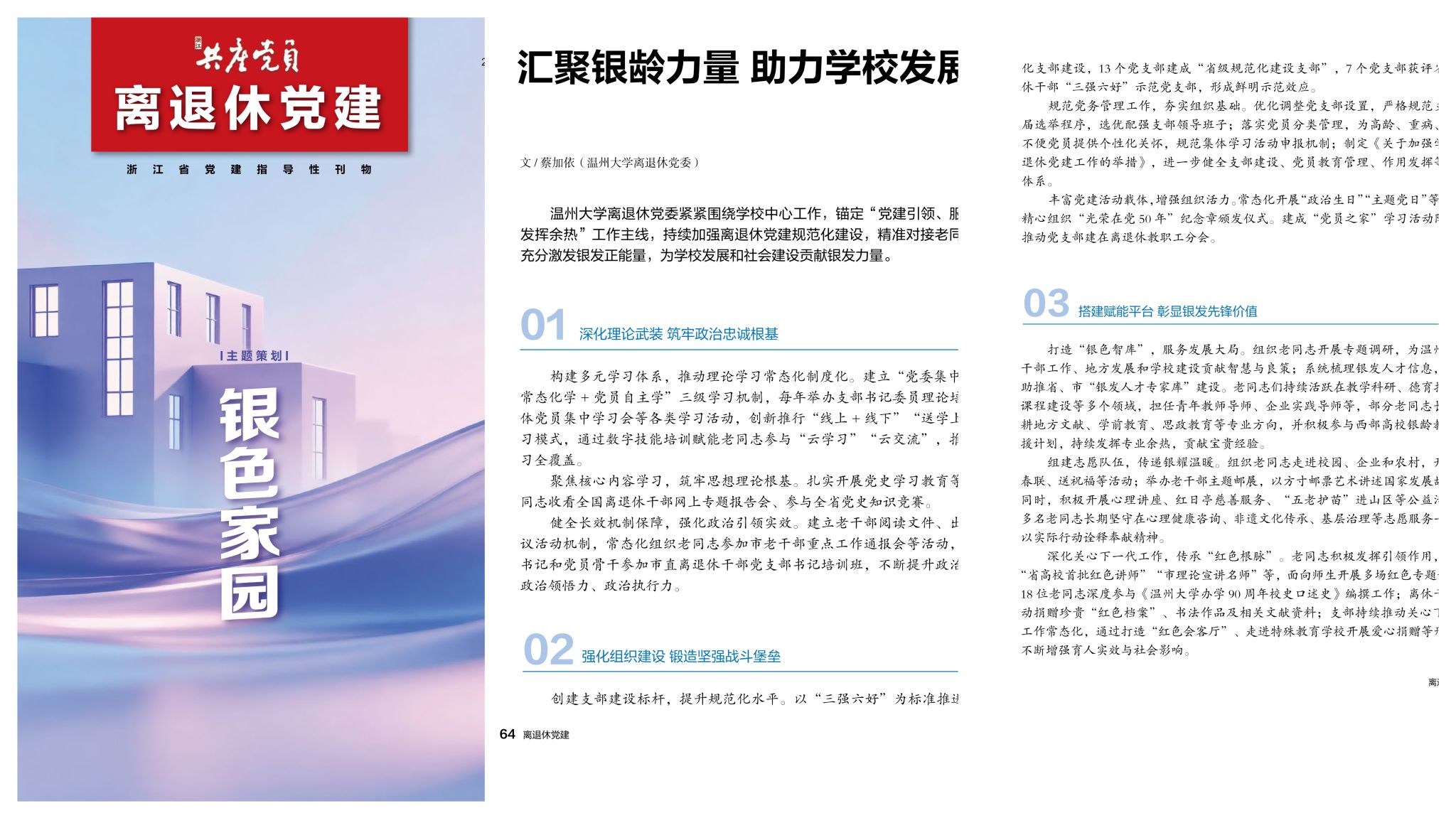 温州大学离退休党委紧紧围绕学校中心工作,锚定 “党建引领、服务为先、发挥余热” 工作主线,持续加强离退休党建规范化建设,精准对接老同志需求,充分激发银发正能量,为学校发展和社会建设贡献银发力量。