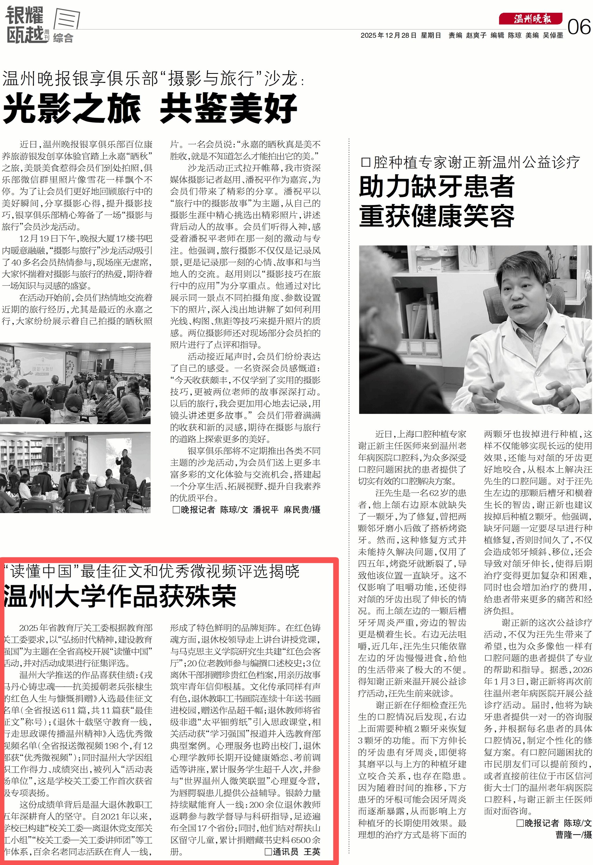 温州大学推送的作品喜获佳绩:《戎马丹心铸忠魂 —— 抗美援朝老兵张棣生的红色人生与慷慨捐赠》入选最佳征文名单(全省报送 611 篇,共 11 篇获 “最佳征文” 称号);《退休十载坚守教育一线,行走思政课传播温州精神》入选优秀微视频名单(全省报送微视频 198 个,有 12 部获 “优秀微视频”);同时温州大学因组织工作得力、成绩突出,被列入 “活动获表扬单位”,这是学校关工委工作首次获省级专项表扬。