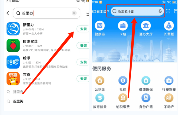 1.手机应用市场(苹果手机通过APP Store)搜索下载“浙里办”,打开“浙里办”进行账号注册(已完成注册的老同志可输入手机号或身份证号码直接登录),进入后在顶部搜索框输入“浙里老干部”,在搜索结果内点击“浙里老干部”进入应用首页即完成注册。