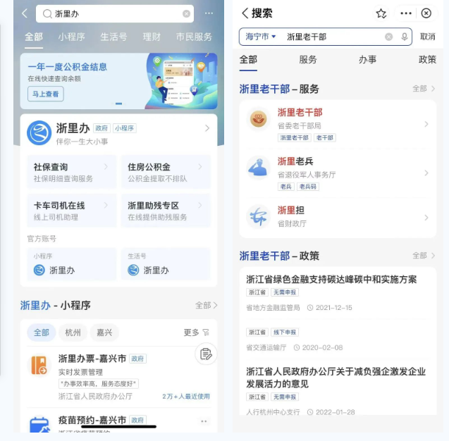 2.进入手机支付宝搜索“浙里办”平台,登陆后搜索“浙里老干部”,在搜索结果内点击“浙里老干部”进入应用首页即完成注册。